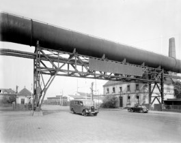 Große Rohrleitung über der Essener Straße am alten Walzwerk in Oberhausen (Nähe Werksgasthaus), 25.05.1940