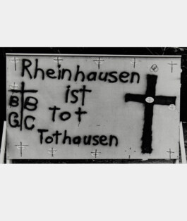 Plakativ: „Rheinhausen ist tot – Tothausen“, Holztafel vor der Mahnwache an Tor 1, 9. Mai 1988