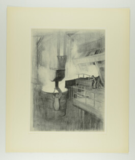 Kohle-/ Bleistiftzeichnung von Horst Jörn, aus: Grafikmappe „Studierende der Folkwang Werkkunstschule Essen sehen das Hüttenwerk Rheinhausen“, 1950