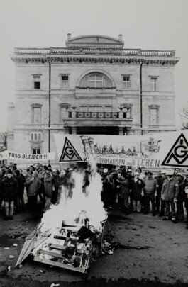 Begonnen hatte alles im Jahr 1987, als die Krupp Stahl AG das Aus für ihr Hüttenwerk in Duisburg-Rheinhausen zum 31.Dezember 1988 verkündete. Die anfängliche Schockstarre bei den Beschäftigten verwandelte sich nur wenig später in große Wut und setzte einen langen und beispiellosen Arbeitskampf in Gang. Für den Erhalt von 5.600 Arbeitsplätzen gingen die Beschäftigten monatelang auf die Straße. Am 10. Dezember 1987 besetzten die Krupp-Arbeiter die Rheinbrücke, die von Duisburg-Hochfeld nach Rheinhausen führt – eine Protestaktion, die medial seinerzeit weit über die Region hinaus große Aufmerksamkeit erlangte. Bis heute wird sie im kollektiven Gedächtnis als „Brücke der Solidarität“ erinnert. Unter dem Motto „wenn es an der Ruhr brennt, hat der Rhein nicht so viel Wasser, um dieses Feuer zu löschen“ machten die Stahlkocher auf ihre existenzbedrohende Situation lautstark aufmerksam. Zunächst mit Erfolg! Eine riesige Solidaritätswelle schwappte durch die Rhein-Ruhr-Region und Tausende von Menschen nahmen an zahlreichen Kundgebungen teil. Zu den Höhepunkten dieser Proteste gehörte fraglos die Belagerung der Villa Hügel, des Kruppschen Stammsitzes in Essen. Beschäftigte von Krupp erhielten hier massive Unterstützung durch nicht direkt betroffene Bürgerinnen und Bürger und rund 10.000 Schülerinnen und Schüler. Und tatsächlich gelang es, die sofortige Schließung des Hüttenwerks in Rheinhausen abzuwenden. Doch alle Vermittlungsversuche, das unvermeidliche Aus letztlich zu verhindern, scheiterten schließlich. Trotz aller Proteste endete im August 1993 nach dem letzten Abstich im Stahlwerk LD II eine fast 100-jährige Industriegeschichte. Der zähe Widerstand der Kruppianer hatte sich schließlich aber doch ausgezahlt. Die letzten 1.900 Stahlarbeiter aus Rheinhausen wechselten zu den Hoesch-Stahlwerken nach Dortmund und alle restlichen Beschäftigten konnten ab dem 56. Lebensjahr in den Vorruhestand gehen.